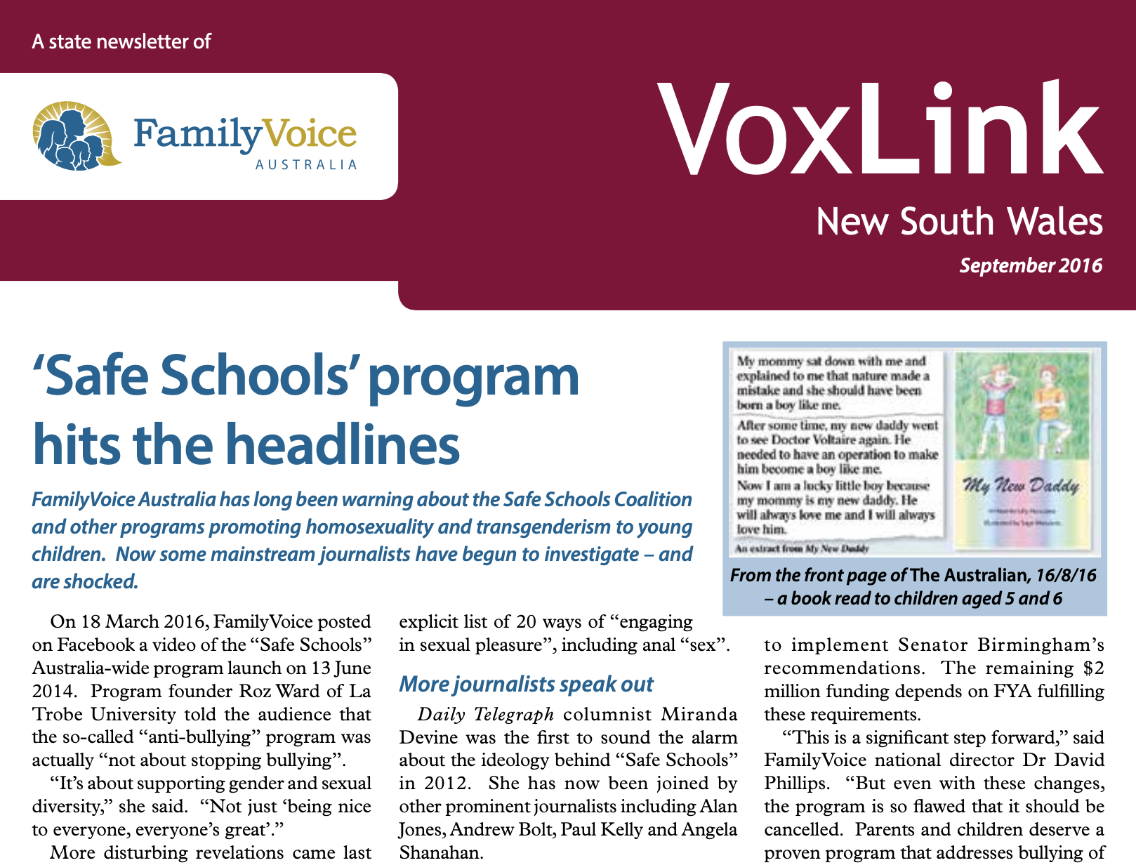 In this issue: 'Safe Schools' program hits the headlines... NSW petition on 'Safe Schools'... Transgender warning... Multicultural communities reject 'Safe Schools'... NSW Greens' draconian abortion bill... Same-sex 'marriage': no benefit... Whatever happened to human rights?... Letters... Kerry says sorry... Same-sex'Marriage': what it really means
