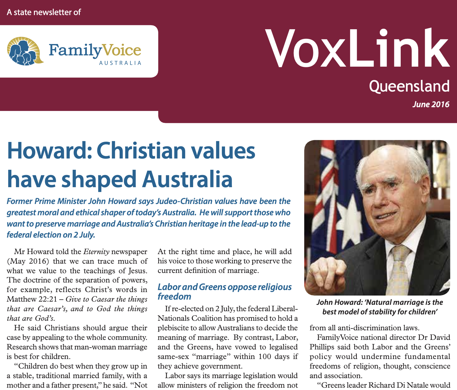 In this issue: Howard: Christian values have shaped Australia... What does the Nick Xenophon Team stand for?... Passing on the baton... FamilyVoice censored... Open season on QLD unborn... Why your votes matter... Letters... Where do your candidates stand on importnat issues?